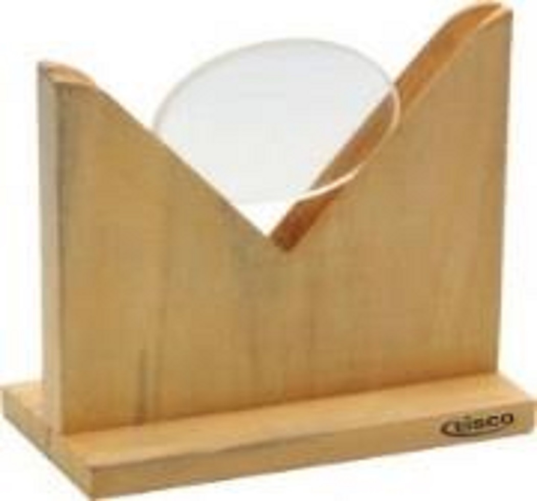 Wooden to take lenses or mirrors up to 76 mm diameter. Comprising an upright 100 mm high, with V shape slot to hold a convex or concave lens, mounted on rectangular base 100 x 50 mm An index mark is engraved on each end of the
